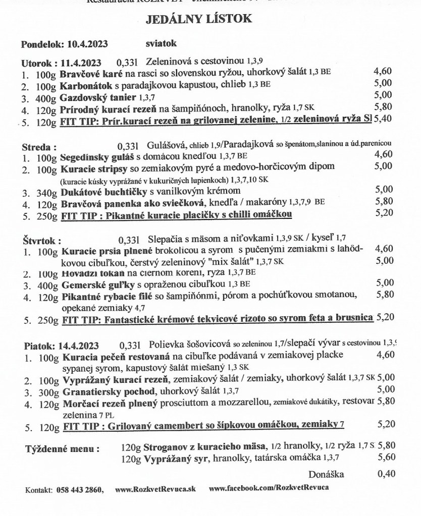 Jedálny lístok od 11.4. do 14.4.2023 Publikoval(a):juhasovarenata6 apríla, 20236 apríla, 2023Posted inUncategorized Zdieľaj tento článok: Share on X(Otvorí sa v novom okne) X Zdielať na Facebooku(Otvorí sa v novom okne) Facebook Páči sa mi Nahráva sa... Súvisiace