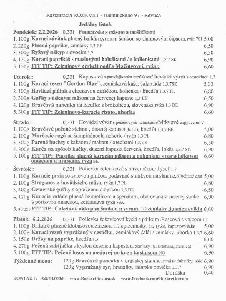 Jedálny lístok od 02.02. do 06.02.2026