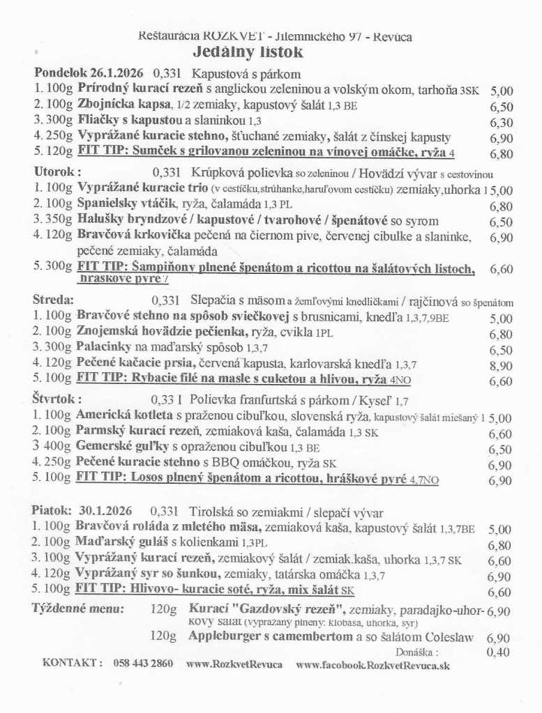 Jedálny lístok od 26.01. do 30.01.2026