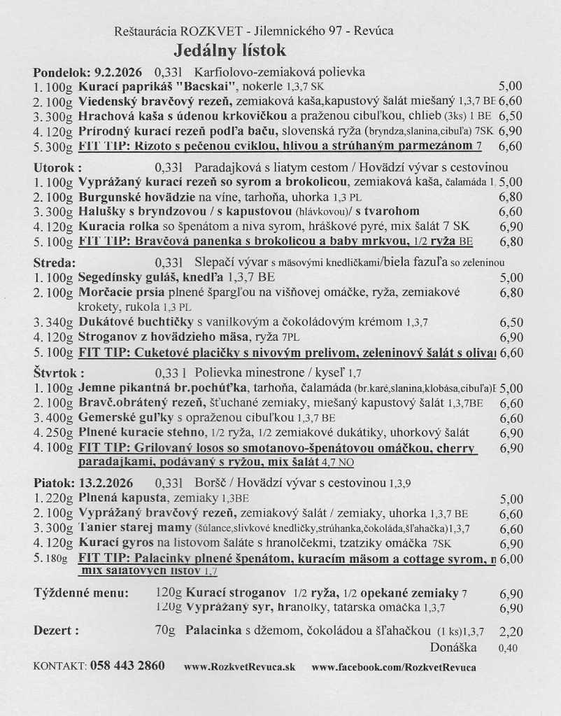 Jedálny lístok od 09.02. do 13.02.2026