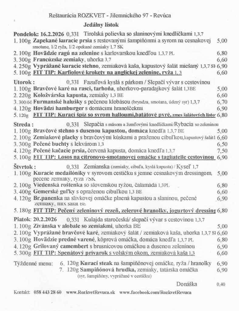 Jedálny lístok od 16.02. do 20.02.2026