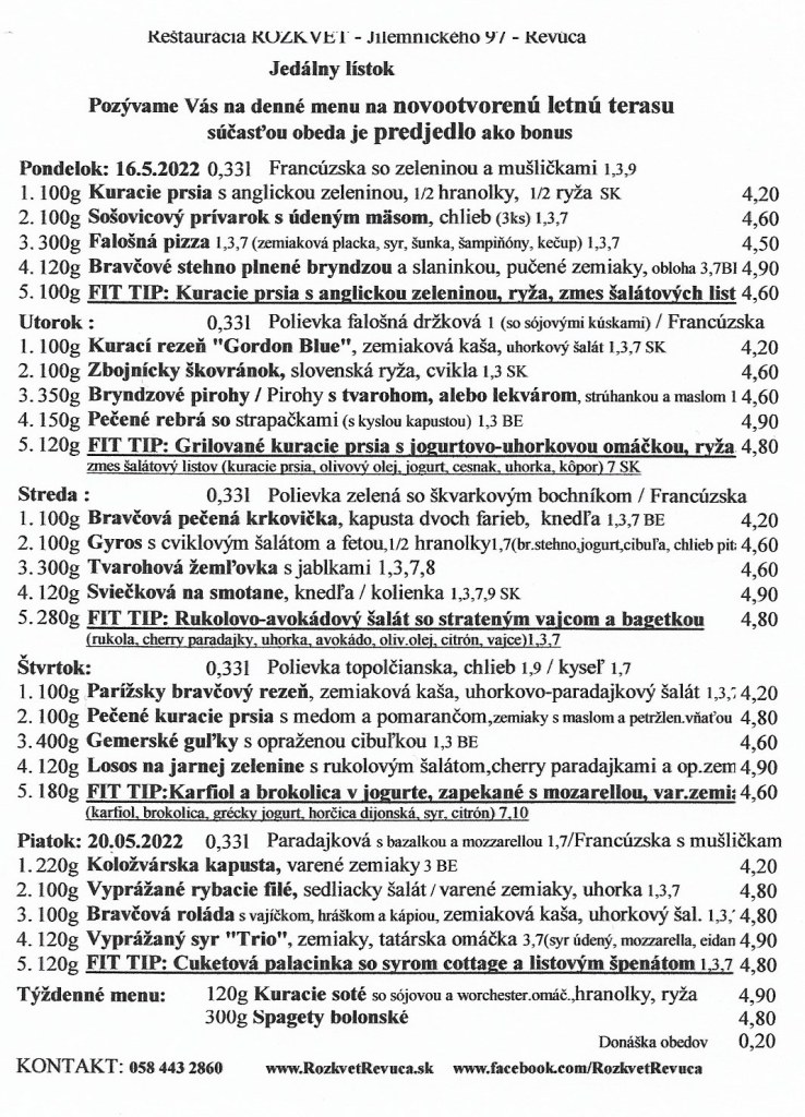 Jedálny lístok od 16.5. do 20.5.2022