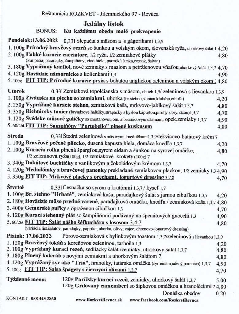 Jedálny lístok od 13.6. do 17.6.2022