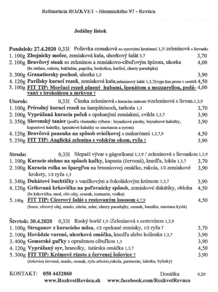 Jedálny lístok od 27.4. do 30.4.2020