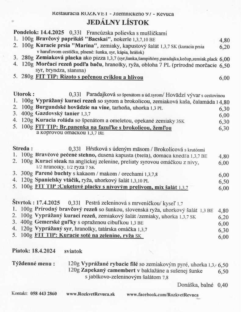 Jedálny lístok od 14.04. do 18.04.2025