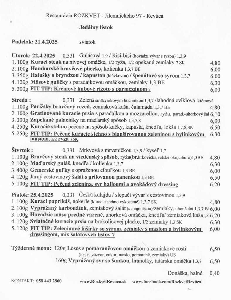 Jedálny lístok od 21.04. do 25.04.2025