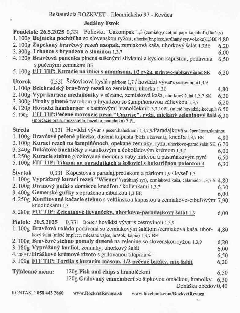 Jedálny lístok od 26.05. do 30.05.2025